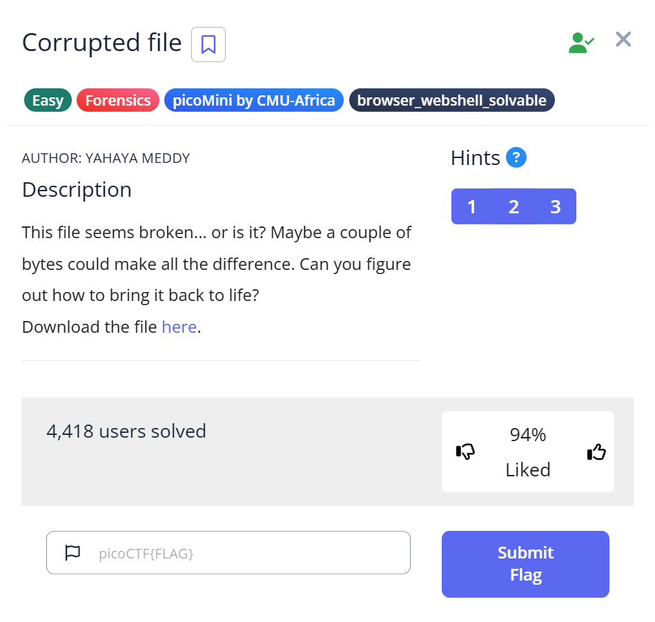 This challenge involves inspecting a mysterious file downloaded from here, understanding its format, repairing broken magic numbers, and ultimately retrieving the flag embedded in the restored image.