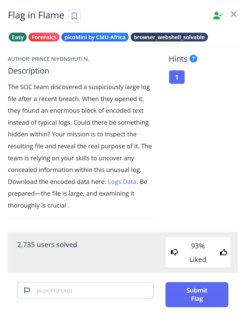 You are given a text file (logs.txt) that contains a very long Base64-encoded line. By decoding that Base64 you recover binary data (a PNG). Inspecting the PNG reveals a long hex string embedded in the image; decoding the hex yields the final flag. This is a small forensics pipeline: Base64 → file identification → image → hex → plaintext.