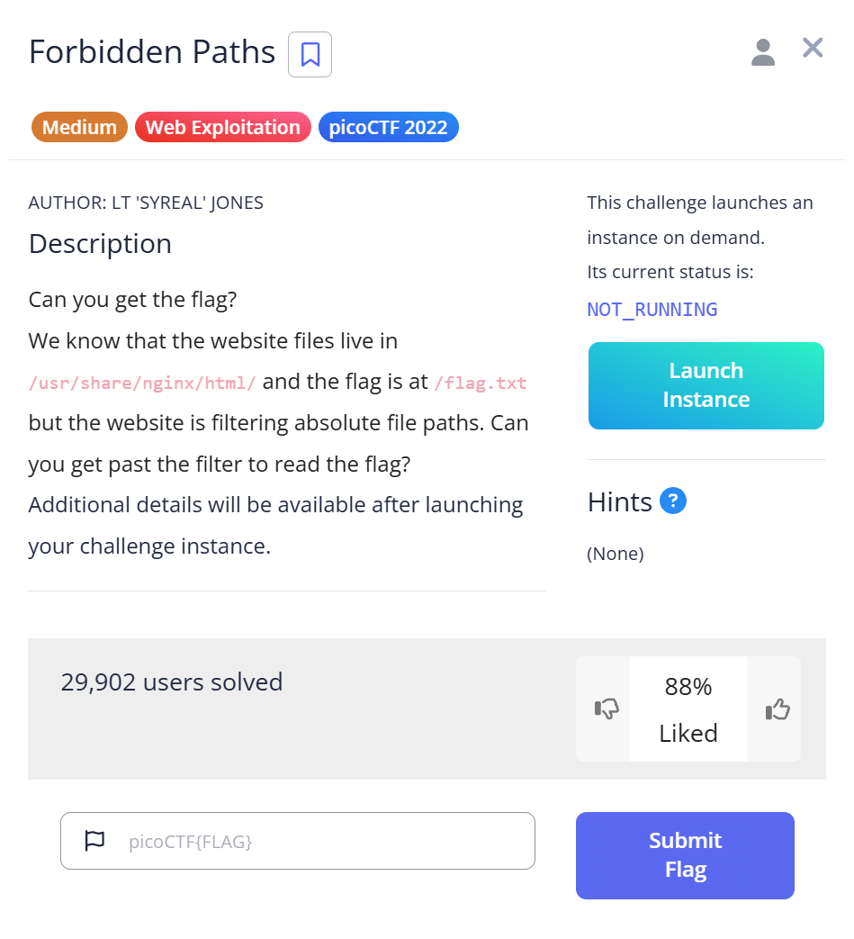 In this web challenge the application blocks absolute file paths (for example /usr/share/nginx/html/flag.txt) but fails to properly block relative path traversal. By submitting a relative path that climbs up directories (e.g. ../../../../flag.txt) — or its percent-encoded equivalent — you can bypass the absolute-path filter and retrieve the flag. This article shows manual and Burp-based approaches and explains why the attack works.