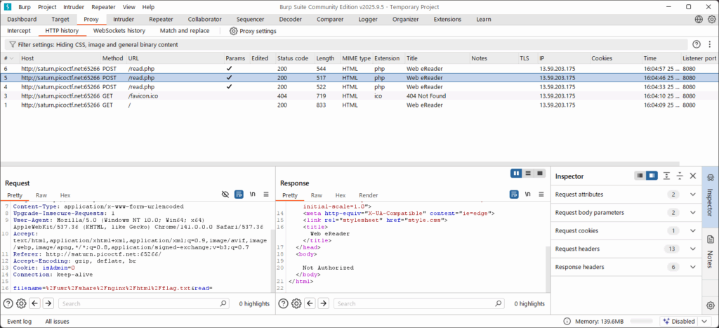 | 3 | Intercept & send filename=..%2F..%2F..%2F..%2Fflag.txt (Burp Repeater) | Precisely control encoding and replay request | Successful retrieval of the flag |