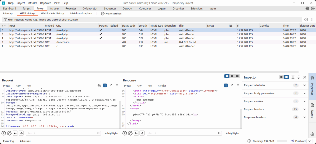 🎉 After sending the relative traversal payload, the application returned the flag:picoCTF{7h3_p47h_70_5ucc355_6db46514}