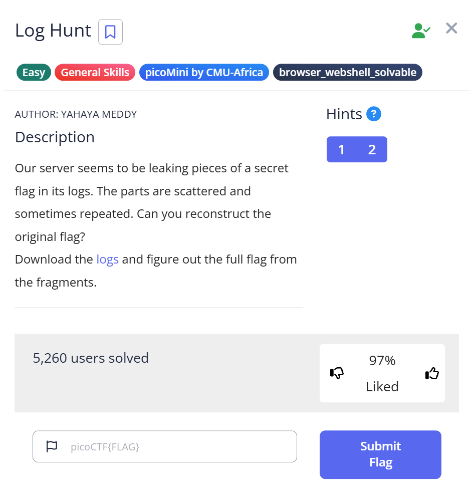 In this challenge, you are given a log file named server.log. By inspecting its contents, you’ll find several pieces of a flag hidden across multiple log entries. Your task is to extract those pieces, piece them together, and reveal the full flag.