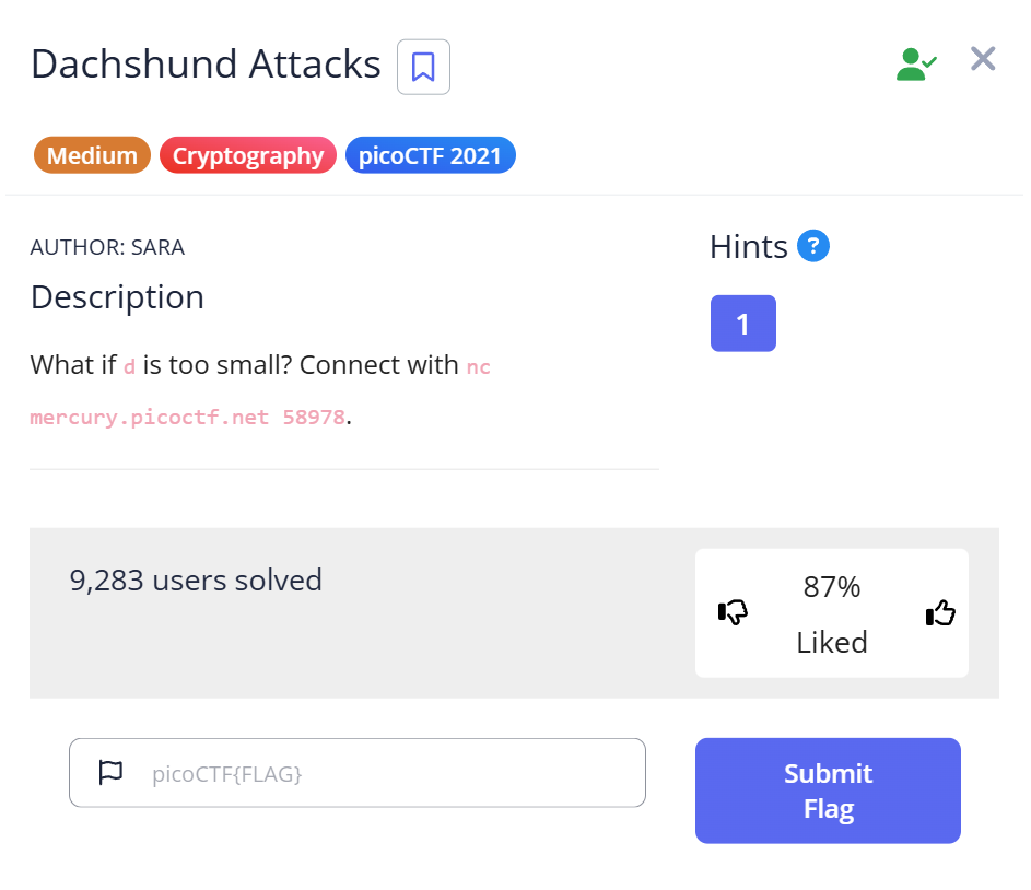 — RSA public exponent, modulus, ciphertext. - 🕵️♂️ Wiener’s attack — Recovers