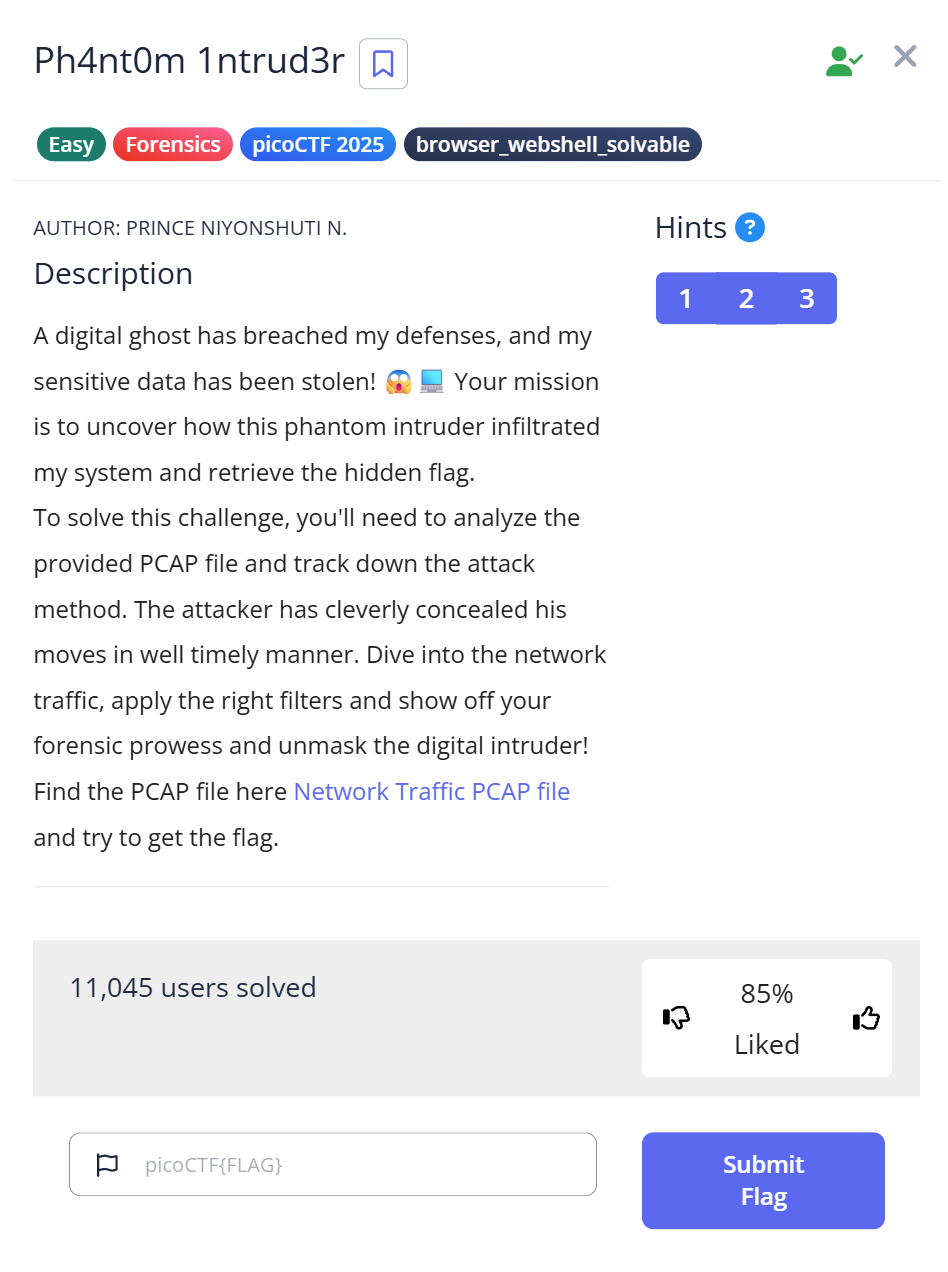 A digital ghost has breached my defenses, and my sensitive data has been stolen! 😱💻 Your mission is to uncover how this phantom intruder infiltrated my system and retrieve the hidden flag.To solve this challenge, you’ll need to analyze the provided PCAP file and track down the attack method. The attacker has cleverly concealed his moves in well timely manner. Dive into the network traffic, apply the right filters and show off your forensic prowess and unmask the digital intruder!Find the PCAP file here Network Traffic PCAP file and try to get the flag.