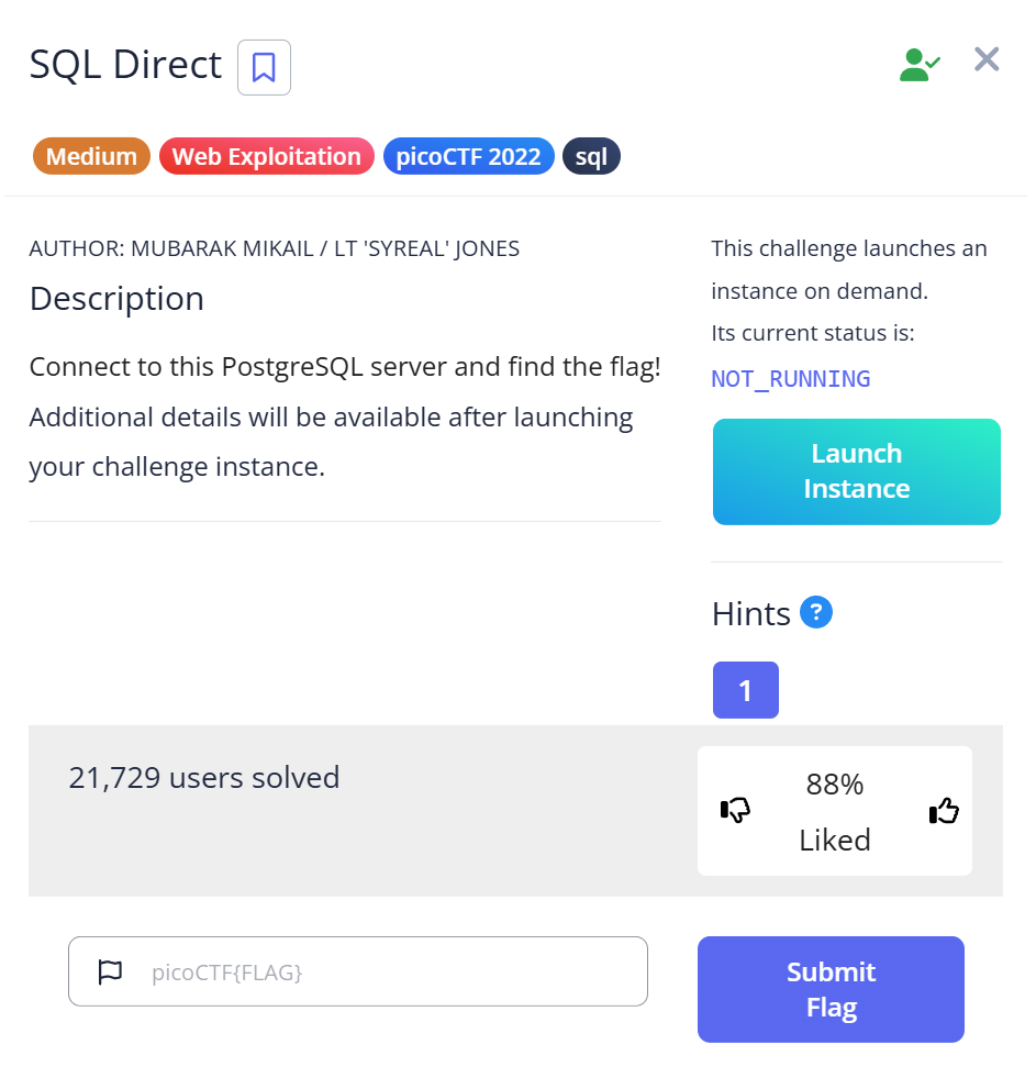 In SQL Direct (AUTHOR: MUBARAK MIKAIL / LT “SYREAL” JONES) you are asked to connect to a remote PostgreSQL server and find the flag stored in a database table. This is a beginner‑friendly exercise in using psql